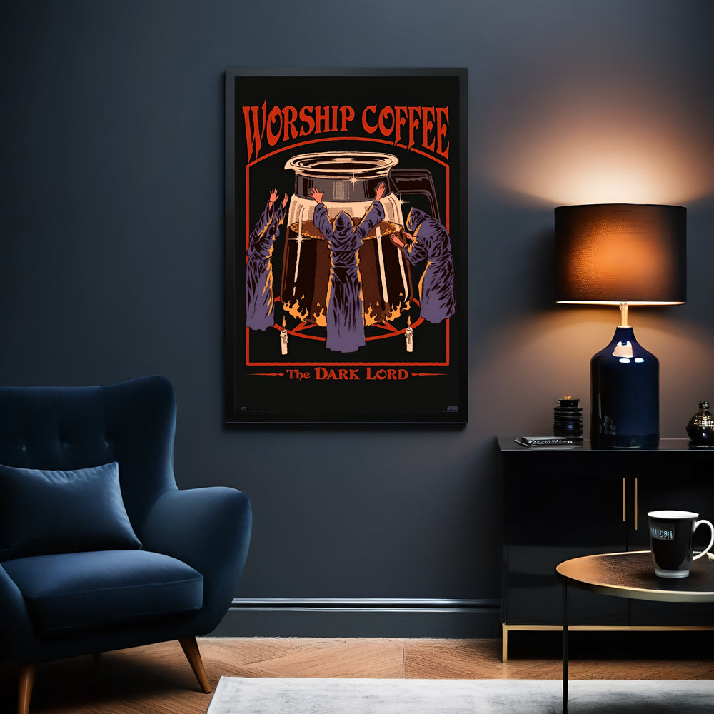 Embrace your devotion—with a dash of dark humour. This cheeky poster by Steven Rhodes features hooded figures worshipping a coffee pot atop a pentagram, captioned “Worship Coffee – The Dark Lord.” It’... Read more